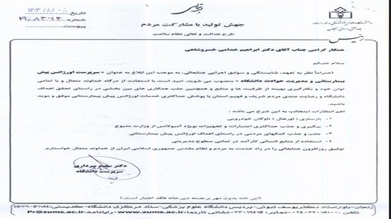 احتراماً نظر به تعهد، شایستگی و سوابق اجرایی جنابعالی، به موجب این ابلاغ به عنوان «سرپرست اورژانس پیش‌بیمارستانی و مدیریت حوادث دانشگاه» منصوب می‌شوید.