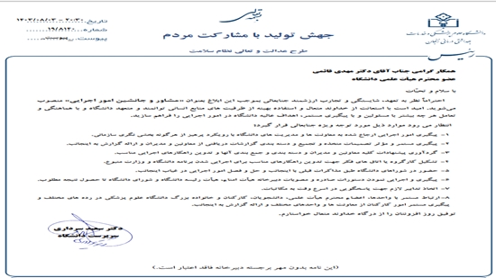 احتراماً نظر به تعهد، شایستگی و تجارب ارزشمند جنابعالی، به موجب این ابلاغ به عنوان «مشاور و جانشین امور اجرایی» منصوب می‌شوید. امید است با استعانت از خداوند متعال و استفاده بهینه از ظرفیت‌های منابع انسانی توانمند و متعهد دانشگاه و با هماهنگی و تعامل هرچه بیشتر با مسئولین و با پیگیری مستمر، اهداف عالیه دانشگاه در امور اجرایی را فراهم سازید.