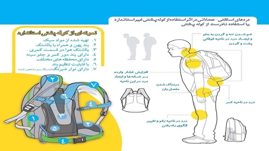 وی در ادامه افزود: استفاده از کوله پشتیهای سبک با پشتی نیمه سخت و دارای سیستم تهویه توصیه میشود. دانش آموزان باید از حمل کتاب و دفترهای اضافی و غیرضروری خودداری کنند.