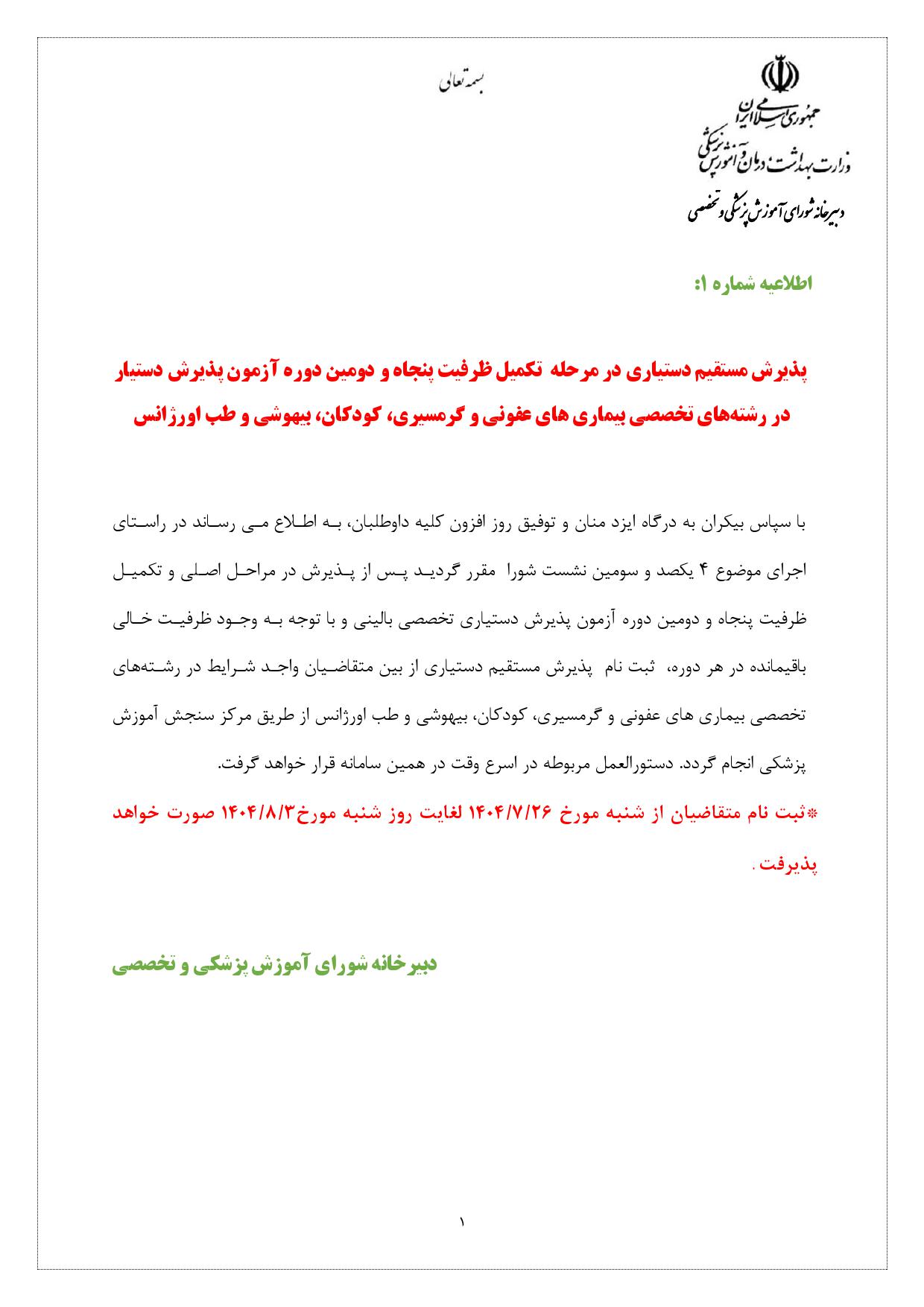 پذیرش مستقیم دستیار در مرحله تکمیل ظرفیت پنجاه و دومین دوره آزمون پذیرش دستیار