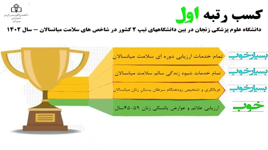 دانشگاه علوم پزشکی زنجان در بین دانشگاه‌های تیپ ۲ کشور در سال ۱۴۰۲، رتبه اولِ شاخص‌های سلامت میانسالان را کسب کرد.