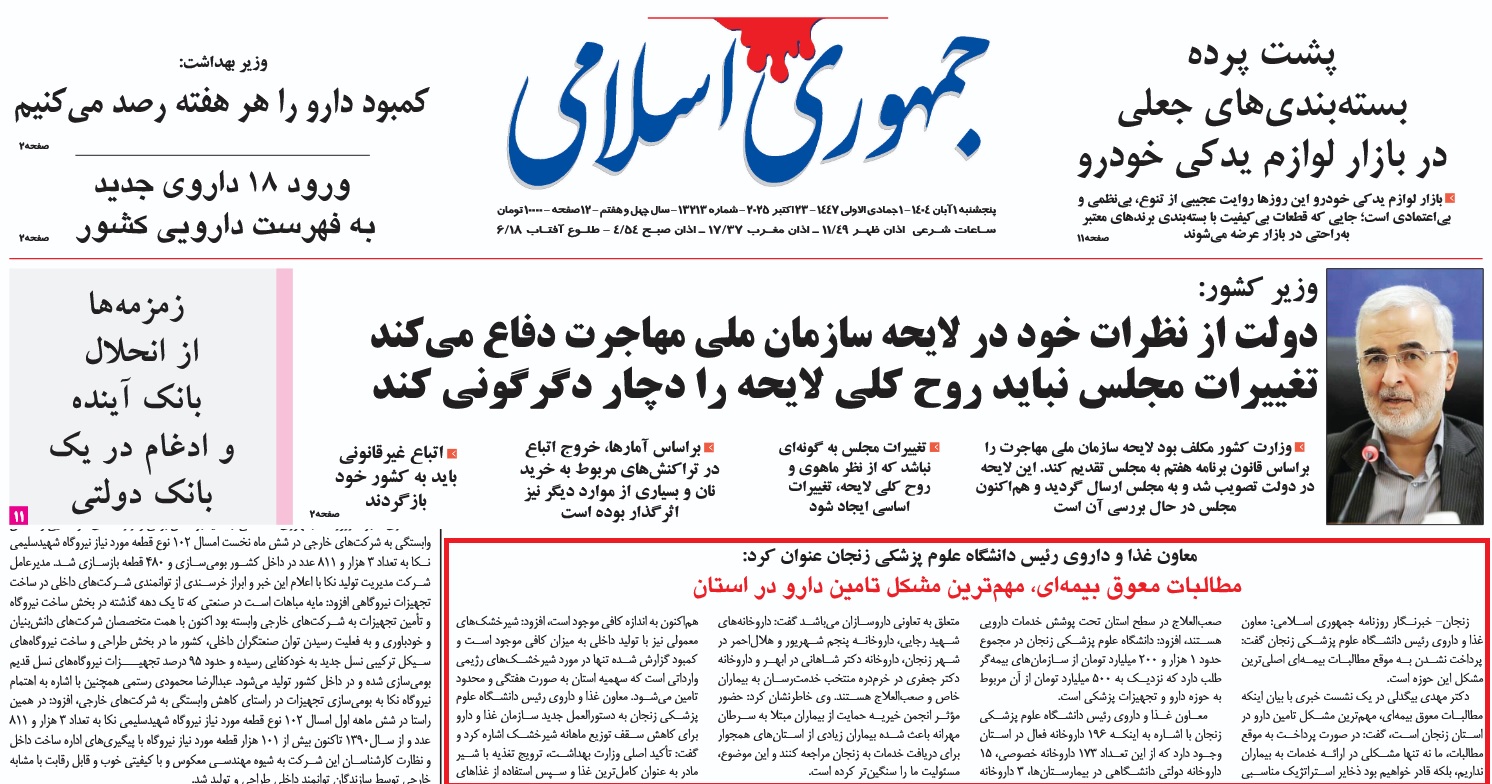بازتاب خبرهای دانشگاه علوم پزشکی زنجان در رسانههای بر خط- 1 آبان 1404/08/01 - 12:52 - تعداد بازدید: 8 - تعداد بازدیدکننده: 8 - کد خبر : 2756 - گروه خبری : رسانه های چاپی 1404 - تعداد نظرات : 0