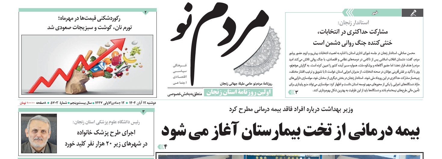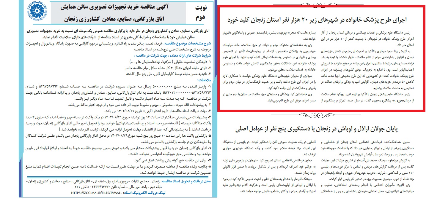 بازتاب خبرهای دانشگاه علوم پزشکی زنجان در نشریات - 12 آبان 1404/08/12 - 14:02 - تعداد بازدید: 6 - تعداد بازدیدکننده: 6 - کد خبر : 2833 - گروه خبری : رسانه های چاپی 1404 - تعداد نظرات : 0