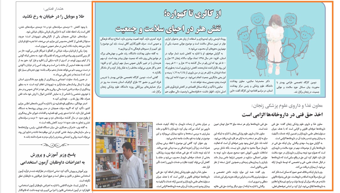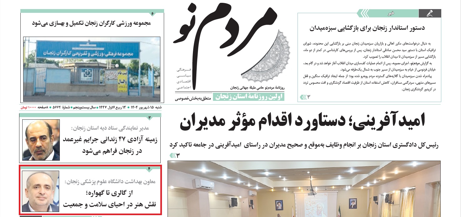 بازتاب خبرهای دانشگاه علوم پزشکی زنجان در نشریات - 15 شهریور 1404/06/15 - 09:46 - تعداد بازدید: 33 - تعداد بازدیدکننده: 33 - کد خبر : 2401 - گروه خبری : بازتاب در رسانه ها,رسانه های چاپی 1404 - تعداد نظرات : 0