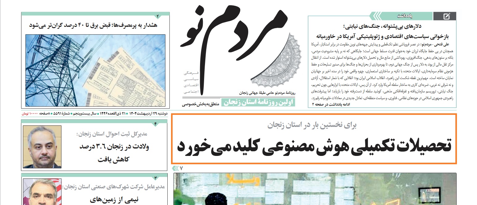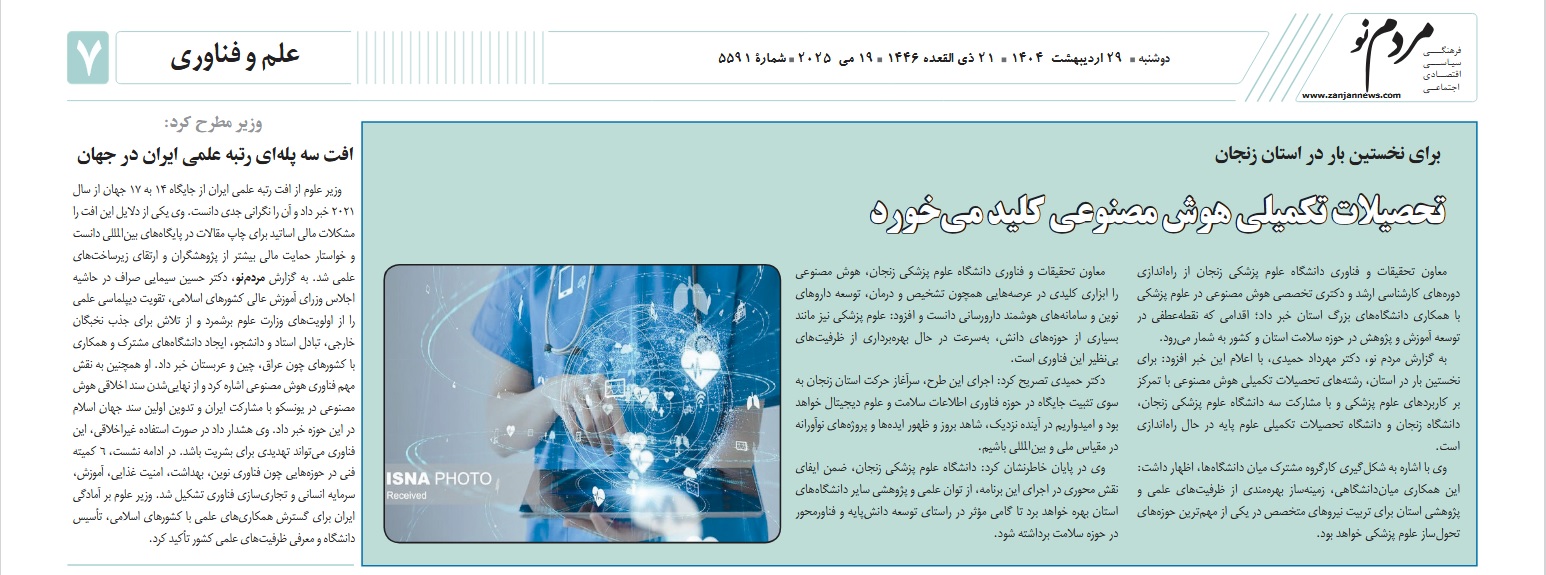 بازتاب خبرهای دانشگاه علوم پزشکی زنجان در نشریات - 29 اردیبهشت 1404/02/29 - 08:42 - تعداد بازدید: 14 - تعداد بازدیدکننده: 14 - کد خبر : 1764 - گروه خبری : رسانه های چاپی 1404 - تعداد نظرات : 0