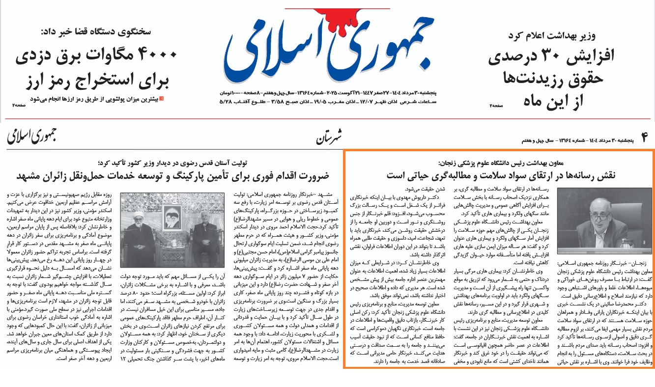 بازتاب خبرهای دانشگاه علوم پزشکی زنجان در نشریات - 30 مرداد 1404/05/30 - 07:44 - تعداد بازدید: 13 - تعداد بازدیدکننده: 13 - کد خبر : 2533 - گروه خبری : رسانه های چاپی 1404 - تعداد نظرات : 0