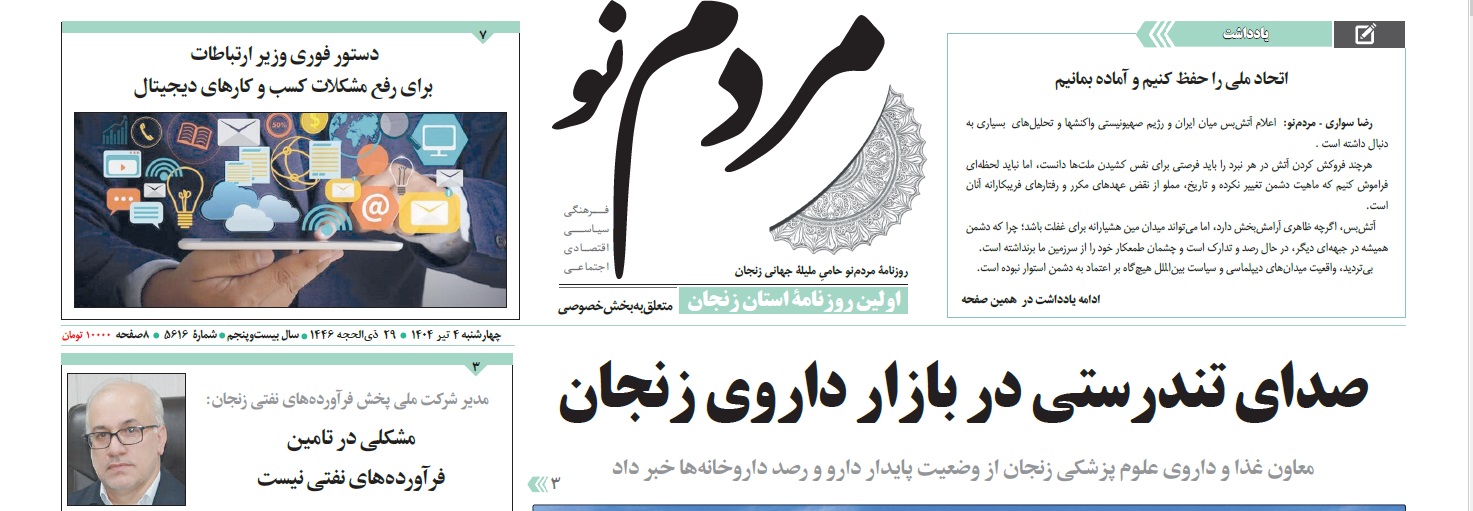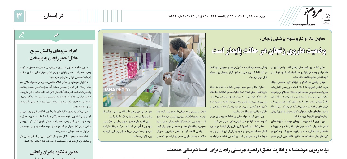 بازتاب خبرهای دانشگاه علوم پزشکی زنجان در نشریات - 4 تیر 1404/04/04 - 11:15 - تعداد بازدید: 19 - تعداد بازدیدکننده: 19 - کد خبر : 2093 - گروه خبری : رسانه های چاپی 1404 - تعداد نظرات : 0
