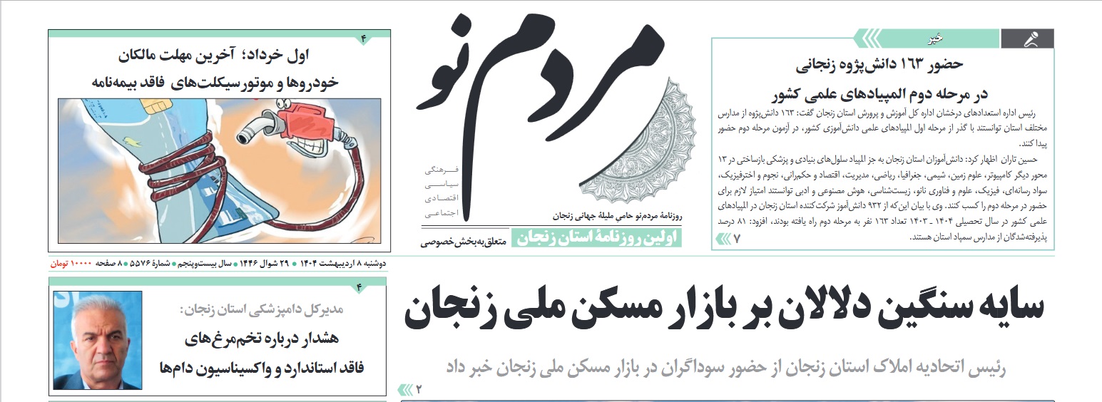 بازتاب خبرهای دانشگاه علوم پزشکی زنجان در نشریات - 8 اردیبهشت 1404/02/08 - 08:59 - تعداد بازدید: 13 - تعداد بازدیدکننده: 13 - کد خبر : 1639 - گروه خبری : رسانه های چاپی 1404 - تعداد نظرات : 0