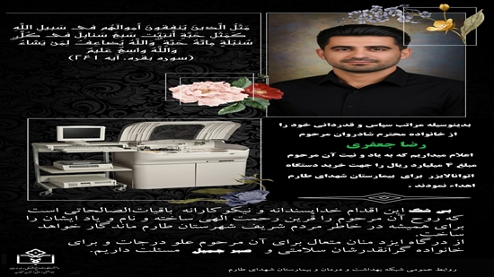 خانواده زنده یاد رضا جعفری مبلغ ۲۰۰ میلیون تومان به منظور تهیه یک دستگاه اتوآنالایزر برای آزمایشگاه بیمارستان شهدای طارم اهدا کردند.