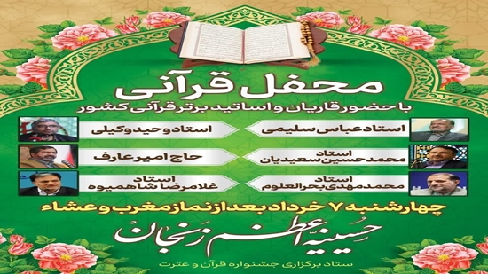 محفل بزرگ انس با قرآن باحضور قاریان و اساتید برتر قرآنی کشور و شرکتکنندگانِ بیست و نهمین جشنواره قرآن و عترت وزارت بهداشت در حسینیه اعظم زنجان، برگزار شد.
